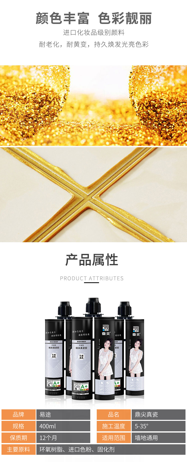 是雙組份AB反應(yīng)固化型粘膠劑,是一種半流狀液體,它不同于白水泥、彩色填縫劑(干粉類 水泥材料+低檔顏料,主要由無機(jī)材料組成)。鼎尖真瓷主要成份:環(huán)氧樹脂、顏料、助劑 (如止流劑)等。是一種主要用于瓷磚縫隙美化裝飾用的高分子新型建材。 ![]() 讓產(chǎn)品回歸自然,拒絕生物污染,開啟美縫新時(shí)代 為什么選擇易途國際美縫劑 ![]() 易途--值得信賴的品牌