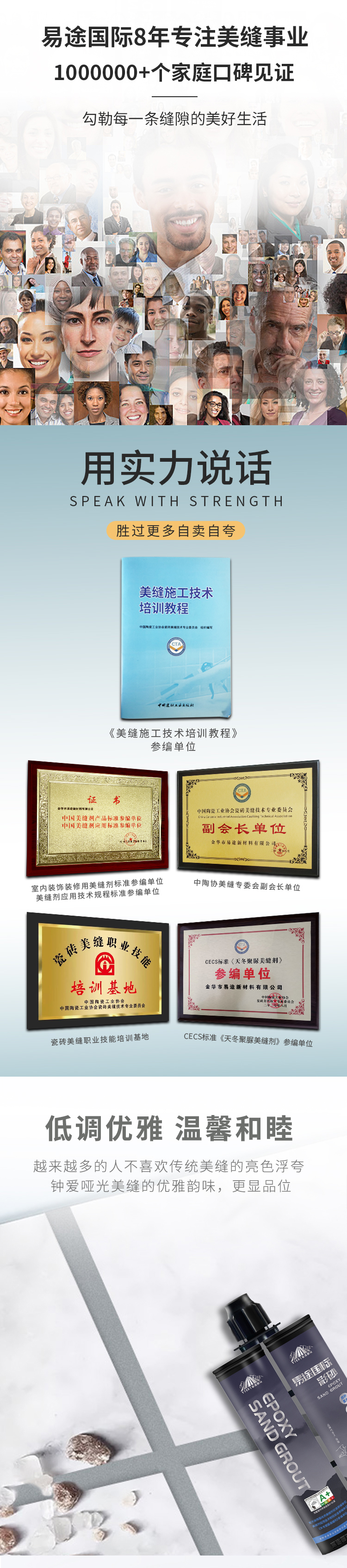 苯和重金屬等有害物質(zhì);耐酸堿、耐水洗、耐變黃,防水防油防污;解決環(huán)氧彩 砂類產(chǎn)品施工難題(縫隙發(fā)白,固化劑殘留);與真瓷產(chǎn)品一樣施工,施工方便, 是市場稀缺性產(chǎn)品。 ![]() 讓產(chǎn)品回歸自然,拒絕生物污染,開啟美縫新時代 為什么選擇易途國際美縫劑 ![]() 易途--值得信賴的品牌