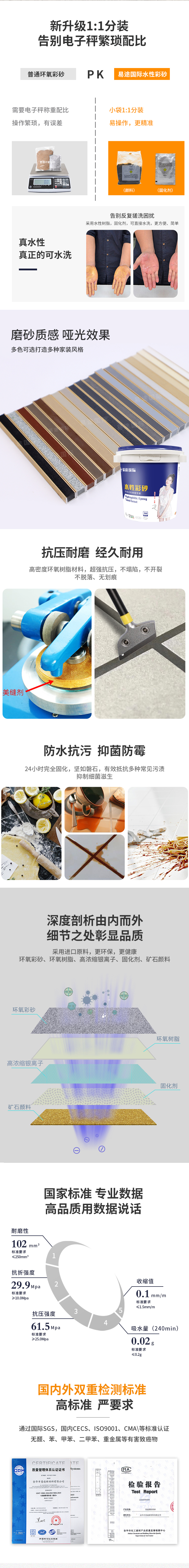 易途國際水性彩砂采用水性環(huán)氧樹脂作為固化劑,產(chǎn)品施工涂抹后可直接水洗擦凈,產(chǎn)品具有施工簡單、方便安全、效率高效的特點。該產(chǎn)品具有高粘結(jié)度、強附著力,使用壽命長,韌性強勁的優(yōu)勢。使用產(chǎn)品美縫后具有自然柔和、質(zhì)感細(xì)膩、磨砂質(zhì)感、輕奢典雅的顯著特點。