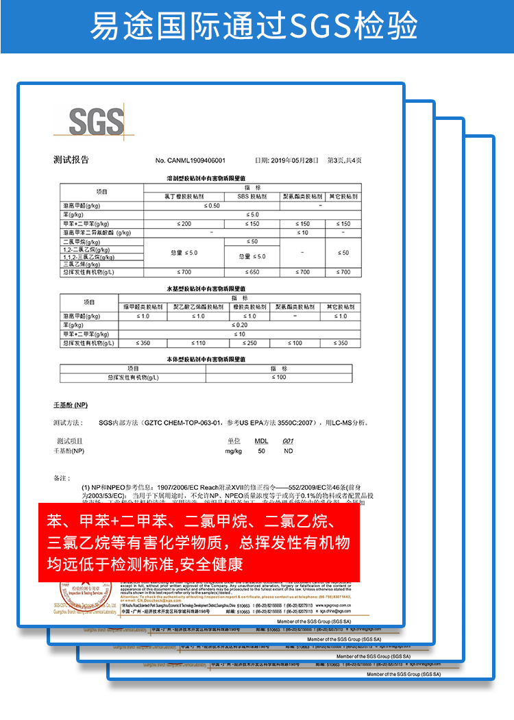 易途國(guó)際美縫作為美縫行業(yè)一顆興起的新星,在原材料上不僅嚴(yán)苛要求,更貫徹“綠色環(huán)保”理念,所有產(chǎn)品皆不含“甲醛”、“甲苯”等有害化學(xué)物質(zhì),落地保障消費(fèi)者健康。