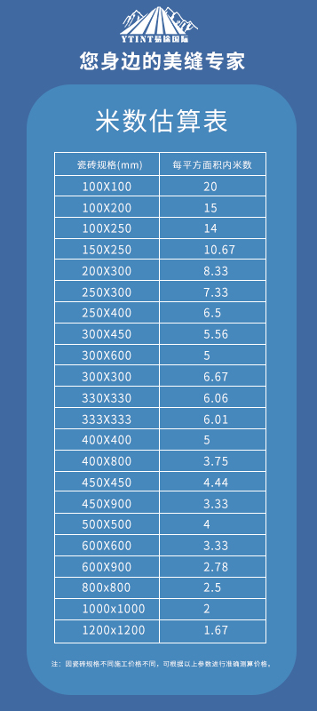 在裝修時,美縫劑的量是根據(jù)瓷磚縫隙的大小和多少決定的。市面上大多數(shù)美縫劑的凈含量為400ml,而我們只需用瓷磚的長寬相乘得到瓷磚總長,再乘以瓷磚塊數(shù)即可。