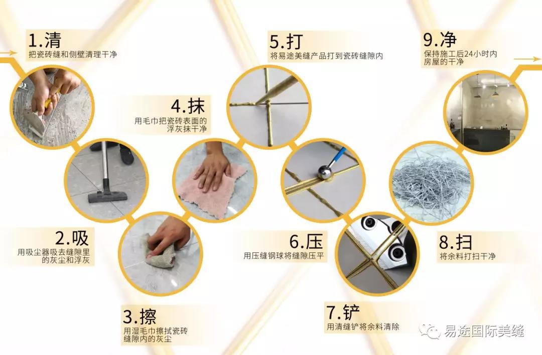 3 4 施工步驟的實(shí)施 一般而言,美縫施工主要包括以下幾個(gè)步驟:清理縫隙、裝槍施工、壓縫刮縫、清潔處理。如果是仿古磚在施工過(guò)程中還需要粘貼美紋紙,避免傷到瓷磚。在每一個(gè)環(huán)節(jié)和步驟的時(shí)候,我們要做到仔仔細(xì)細(xì)精益求精,一個(gè)好的態(tài)度才會(huì)讓業(yè)主感到滿意。